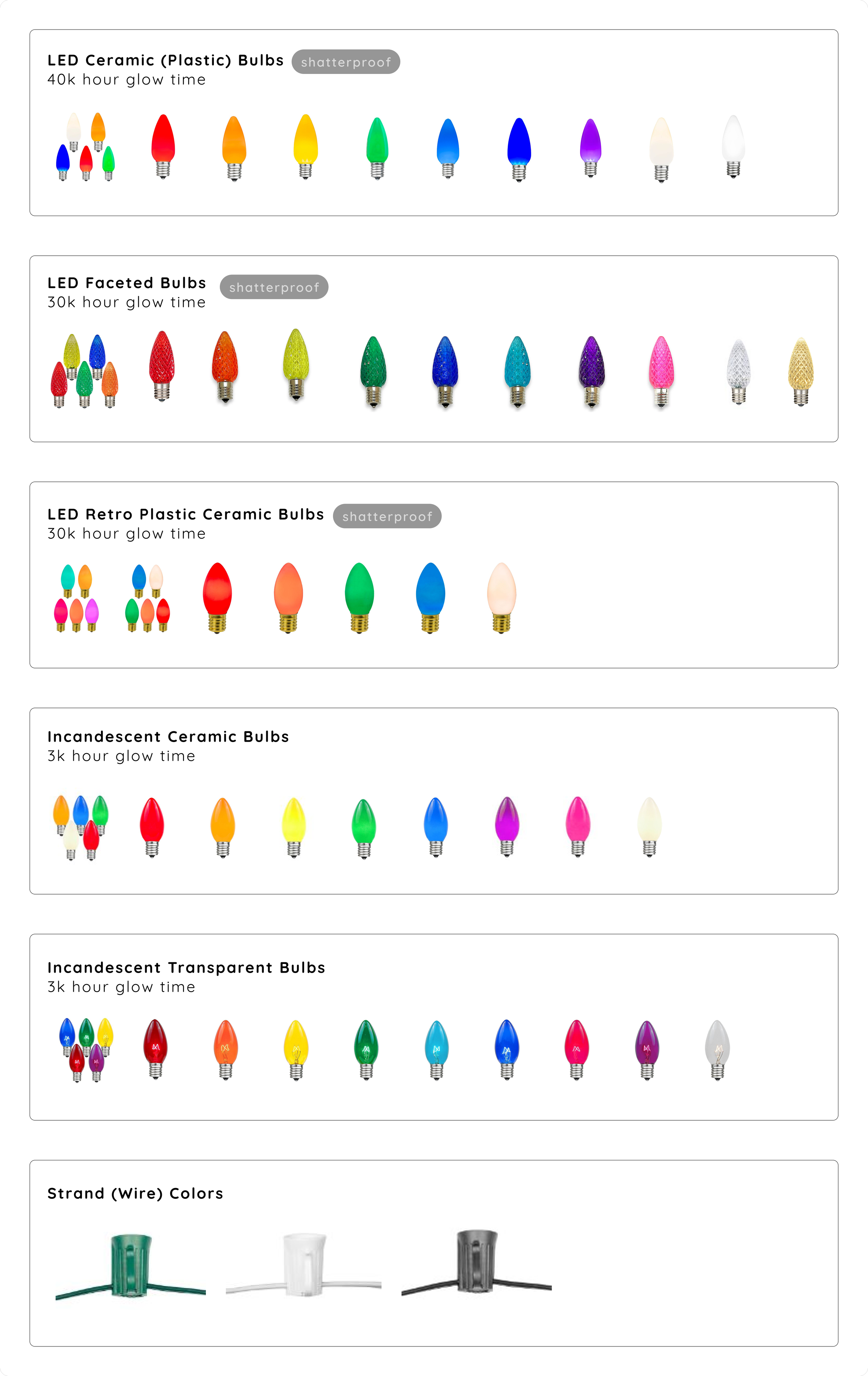 We custom order lights especially for your project so go ahead dream big! Bulbs come in a variety of colors, styles and textures and strand (wire) comes in variety of colors too. Contact us to discuss your ideas and get a fast, free quote!
